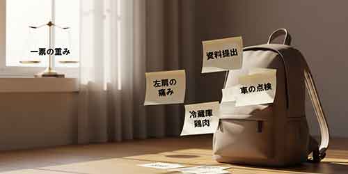 「資料の提出期限が近づいている。近ごろ左肩が痛い。冷蔵庫の鶏肉を片付けないと。車の点検が近い。この間の失敗が…」など。