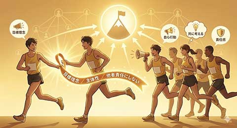 その基本は ①目標理念が根付いている ②傍観者主義にならない ③他者責任にしない、この3つができてこそ、好循環を生み出しチームは成長すると述べられています。