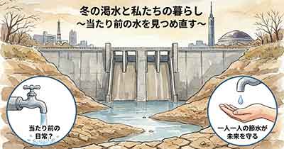 断水などの事態にならないことを願い今後の降雨にも期待はしますが、一方では当たり前ではない非日常の生活を想像して、リスクは何か、一人一人がとれる行動は何か、水の使い方は適切かなど、冬渇水を日常の当たり前を見つめ直す機会と捉えてみてはいかがでしょう。